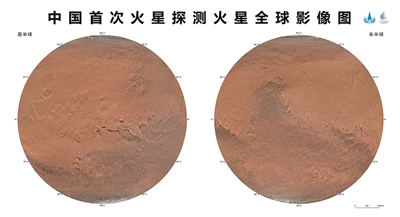 ■这是4月24日发布的火星东西半球正射投影图。 当日,在2023年“中国航天日”主场活动启动仪式上,国家航天局和中国科学院联合发布中国首次火星探测火星全球影像图,“天问”探火取得的科学成果受到广泛关注。 我国首次火星探测任务工程总设计师张荣桥介绍,天问一号任务环绕器中分辨率相机,于2021年11月至2022年7月历时8个月,实施284轨次遥感成像,对火星表面实现了全球覆盖。地面应用系统对获取的14757幅影像数据进行处理后得到火星全球影像图。 新华社照片