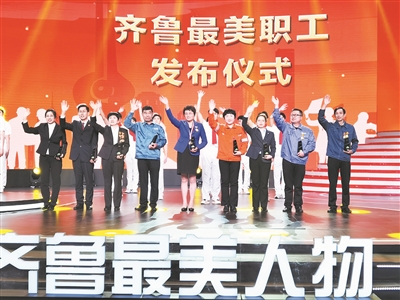 ■“齐鲁最美职工”发布仪式现场,李秋航(前排右五)、赵伟丽(前排右四)接受表彰。