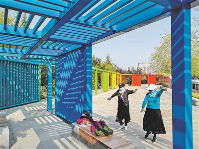 ■市民在双山公园彩虹长廊旁跳舞健身。 赵健鹏 摄