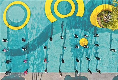 ■北岭山森林公园彩色健身场上投映出晨练者的身影。赵健鹏 摄