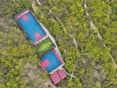■夹岭山公园沉浸在树林中的篮球场和足球场。 韩 星 摄