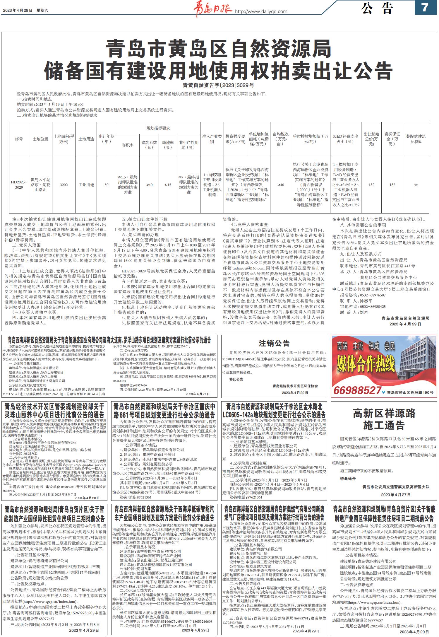 青岛市黄岛区自然资源局储备国有建设用地使用权拍卖出让公告