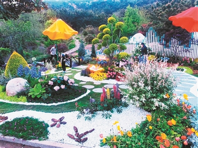 ■市民游客欣赏枯桃花艺生态园“山城花语”花境作品。