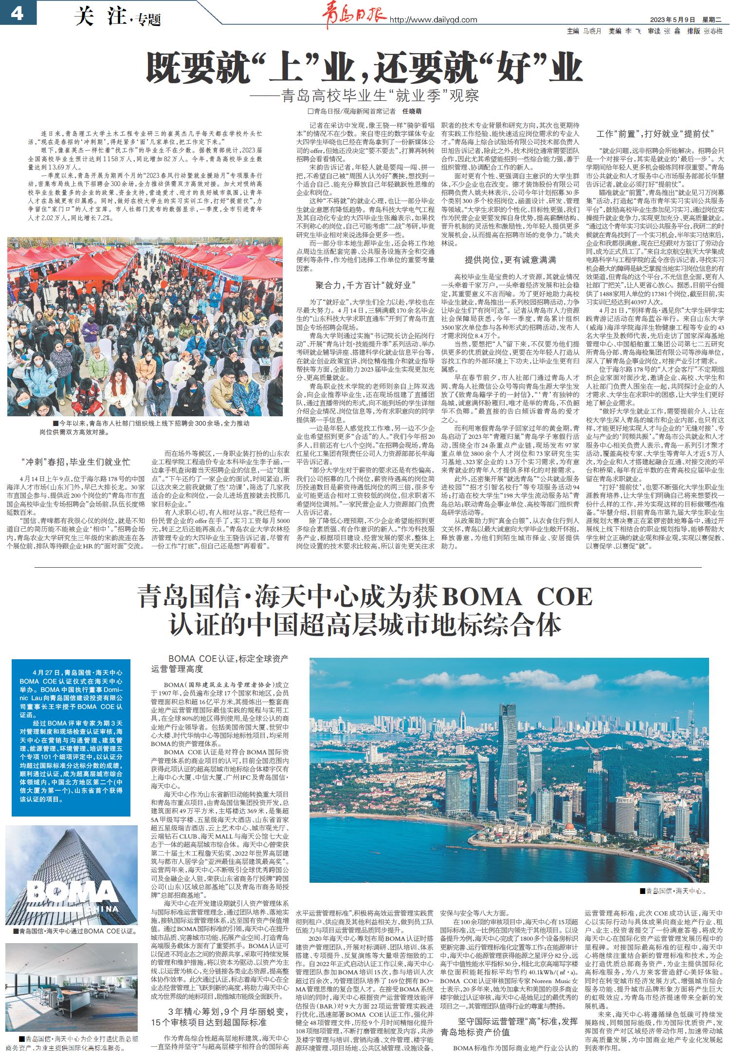 青岛国信·海天中心成为获BOMACOE认证的中国超高层城市地标综合体