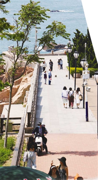 2018年,滨海步行道贯通,将台湾路木栈道与奥帆中心连接。大海与峭壁分立步行道两边,有着独特的韵味。夜间灯光摇曳,蜿蜒的栈道与海交相辉映,远看像一条蛟龙盘在礁石上,成为网红打卡点。