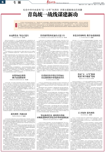 75年前,中共中央发布纪念“五一”劳动节口号,这是我国统一战线和多党合作发展史上具有里程碑意义的重要历史事件。4月25日,纪念中共中央发布“五一口号”75周年座谈会在北京举行。4月28日,青岛市召开纪念中共中央发布“五一口号”75周年座谈会。5月25日,青岛市召开全市各民主党派、无党派人士和党外知识分子、新的社会阶层人士“凝心铸魂强根基、团结奋进新征程”主题教育动员会。在此,本报刊发青岛市各民主党派、工商联负责同志和无党派人士代表署名文章,回顾风雨同舟的光辉历程,展望团结奋进的光明前景,积极推动主题教育走深走实,为加快建设新时代社会主义现代化国际大都市贡献统战智慧和力量。