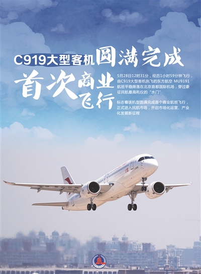 5月28日12时31分,经历1小时59分钟飞行,由C919大型客机执飞的东方航空MU9191航班平稳降落在北京首都国际机场,穿过象征民航最高礼仪的“水门”,标志着该机型圆满完成首个商业航班飞行,正式进入民航市场,开启市场化运营、产业化发展新征程。