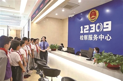 ■日前,青岛市李沧区检察院联合李沧区教体局开展了“检爱同行 共护花开”检察院开放日活动。活动中,青岛虎山路小学师生实地参观了12309检察服务大厅、办案工作区、未成年人法治教育基地,检察官为学生现场讲解法律知识,开展反校园欺凌讲座和知识抢答,增强学生们的法治观念,提高自我保护法律意识。