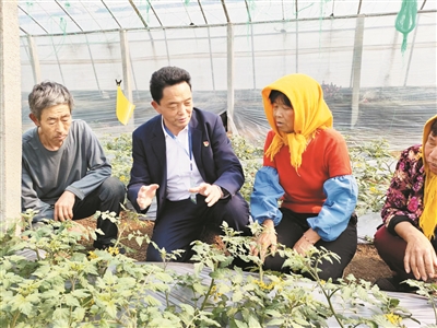 ■高级农艺师王伦世(中)在平度新河镇金山村指导农户如何利用农业新技术提高产量、减少病虫害。