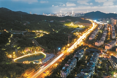 ■夜幕降临,浮山森林公园内灯火璀璨。一个个节点景观、一条条环山绿道纷纷亮灯,扮靓了浮山的夜色,吸引市民游客入园游玩。