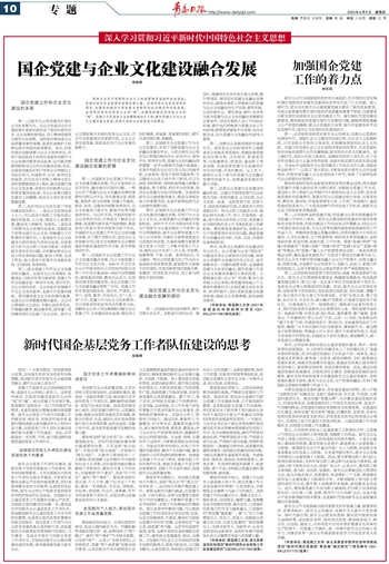第三,国企党建工作和企业文化建设相互融合。从国有企业自身属性、发展理念、目标宗旨等方面来看,党建工作和文化建设是一种你中有我、我中有你,共生共荣的关系。企业的良好发展离不开企业文化的滋养,也离不开党建的浸润。党的建设是企业文化发展的基调,也是企业自身健康发展的基础。企业可以借助民主生活会、专题生活会等形式,开展廉洁教育、政治教育等,既传播了党的建设理论又弘扬了企业文化。国有企业长期发展中形成的优秀企业文化,可以作为党建理论的重要内容,以企业业务促进党建,探索适合自己企业发展的新路子。