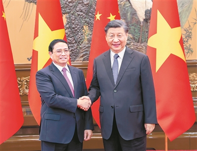 习近平强调,中越同为社会主义国家,是高度互信的同志、互利共赢的伙伴、相知相亲的朋友。双方要深化治党理政经验交流,坚守人民至上理念,坚定支持对方走好符合本国国情的社会主义道路和各具特色的现代化道路。双方要高质量共建“一带一路”,加强发展战略对接,发挥互补优势,加快推进基础设施、智慧海关、绿色能源等领域务实合作。中方愿进口更多适销对路的越南产品,欢迎越方积极参加今年下半年第三届“一带一路”国际合作高峰论坛、中国国际进口博览会。双方要丰富人文交流,增进两国人民特别是年轻一代相互了解,筑牢两国关系发展的社会根基。双方要共同反对“脱钩断链”,反对把经济和科技问题泛政治化,维护国际公平正义和自身发展权益,推动国际秩序朝着更加公正合理的方向发展,为两国现代化建设营造和平稳定的外部环境。