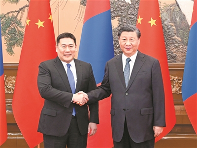 习近平指出,中蒙山水相连、毗邻而居,发展长期睦邻友好关系是双方一道作出的战略选择,完全符合两国人民根本利益。中方高度重视发展中蒙关系,是蒙古国可以信赖和倚重的伙伴。中方愿同蒙方一道,以构建中蒙命运共同体为引领,不断深化两国友好、互信、合作,推动中蒙全面战略伙伴关系向更高水平迈进,为本地区注入更多稳定性和确定性。