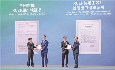 ■2022年1月1日,在RCEP生效落地青岛启动仪式上,青岛开出全国首份RCEP原产地证书、受理首笔出口退税申请。 崔冬妮 摄