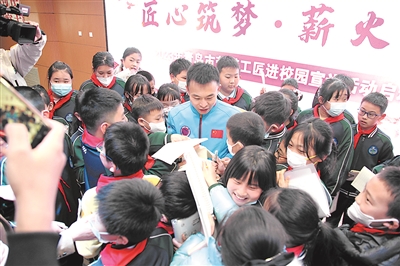 ◀“匠心筑梦·薪火相传”2023年青岛市劳模工匠进校园宣讲活动启动现场。