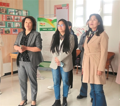 ■曹淑芹(左一)向来访人员介绍村庄“幸福积分”体系和美丽庭院建设情况。