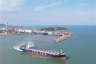 ■青岛造船厂生产的一艘集装箱商船交付国外。