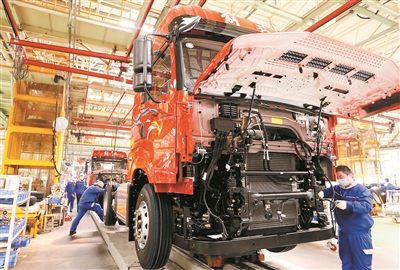■一汽解放总装车间内,工人在组装卡车。