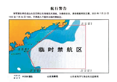 海军部队定于7月23日至7月26日,在成山头至日照以东海域实兵演练,为确保安全,请各船舶特别注意,2023年7月23日15:00至7月26日15:00,不得进入以下5点连线围成的临时禁航区: