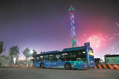 ■真情巴士啤酒节保障公交车穿梭在夜色中。