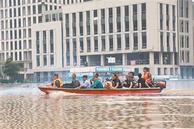 武警河北总队官兵在涿州内涝区域驾舟转移受灾群众(8月4日摄)。 新华社照片