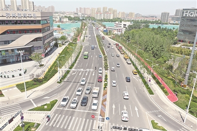 记者在现场看到,宽敞的道路上不时有车辆疾驰而过,两侧的道路附属设施也整装一新,平坦整洁的人行道、可供市民休闲娱乐的健身器材一应俱全,此外整个工程还在绿化带内建设了一条慢行步道,夏天走在其间还有树荫遮日。“在建设过程中,我们充分融合海绵城市理念,人行道面层材料为陶瓷透水砖,基层是大粒径透水混凝土,打造会呼吸的绿色生态步道。”工程项目负责人姜志伟告诉记者。