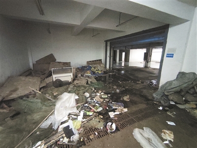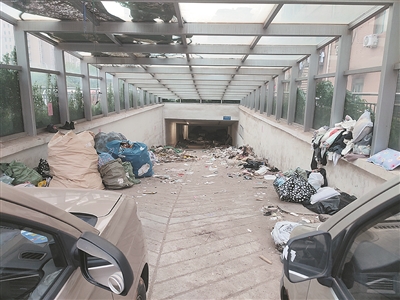 记者查看了山里小区的4个车库,车库出入口处有围挡、障碍物或被车辆堵住。从外面看,车库坡道内都存放着大量废弃物。D区西侧的车库内昏暗潮湿,空中纵横的管道上挂着水珠,部分墙皮脱落,下水道无法正常排水,地面上有积水。