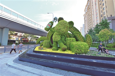 ■胶宁高架桥下靠近青岛啤酒街附近不仅种植了绿植景观带,还融入了啤酒元素的卡通造型。