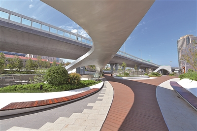 位于胶宁高架桥下胶州路路段的浮岛公园,结合桥面及地面空间作景观布置与绿化提升,在满足人行交通的同时,兼顾居民休憩、观览以及城市形象展示等功能需求,把城市“边角空间”做成了“金角银边”,将人行系统与“空中花园”融为一体。