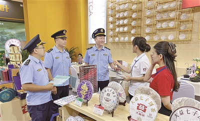 ▲青岛市茶博会上,市场监管人员向商家讲解茶叶适度包装。