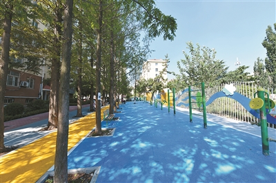 ■阜新路9号的楼院空地新增了健身设备,让居民出门便能活动筋骨。