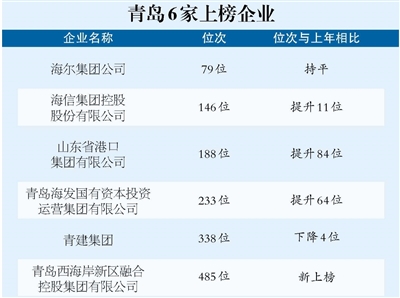 本报9月20日讯 中国企业联合会、中国企业家协会20日在合肥发布2023中国企业500强榜单。榜单以企业2022年营业收入排序,海尔集团公司、海信集团控股股份有限公司、山东省港口集团有限公司、青岛海发国有资本投资运营集团有限公司、青建集团、青岛西海岸新区融合控股集团有限公司等6家青岛企业上榜,较上年增加一家。