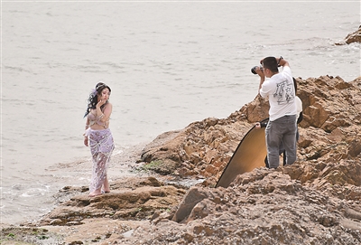 ■八大关的海滩上,一对情侣正在拍摄以人鱼为主题的婚纱照。 王 雷 摄