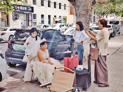 ■一对情侣在老城区做婚纱照拍摄前的准备。 王 雷 摄