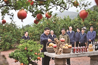 9月24日下午,在返京途中,习近平在山东省委书记林武和省长周乃翔陪同下来到枣庄市考察。枣庄是我国石榴集中连片种植面积最大、品种最多、产业链最完整的地区之一。习近平来到位于峄城区的冠世榴园石榴种质资源库,察看石榴树种,了解当地石榴种植历史、种质资源收集保存和产业发展情况,并来到石榴种植园中向老乡们询问今年石榴种植、收获和收入情况。得知当地大力发展石榴深加工和石榴盆栽培育有力带动了农民增收,习近平很高兴。他指出,人们生活水平在提高,优质特产市场需求在增长,石榴产业有发展潜力。要做好品牌、提升品质,延长产业链,增强产业市场竞争力和综合效益,带动更多乡亲共同致富。祝乡亲们生活像石榴果一样红红火火。
