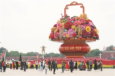 中秋及国庆节假期日益临近,北京天安门广场的“祝福祖国”巨型花篮及长安街沿线立体花坛精彩亮相,吸引游人及市民观赏留念。