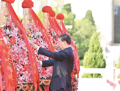 9月30日上午,党和国家领导人习近平、李强、赵乐际、王沪宁、蔡奇、丁薛祥、李希、韩正等来到北京天安门广场,出席烈士纪念日向人民英雄敬献花篮仪式。这是习近平整理花篮上的缎带。 新华社照片