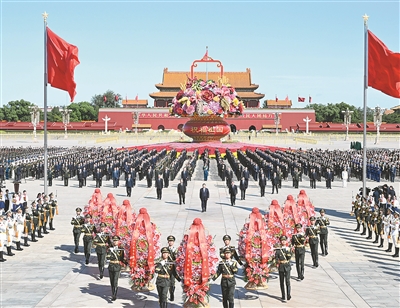 方阵前,以中共中央,全国人大常委会,国务院,全国政协,中央军委,各民主党派、全国工商联和无党派爱国人士,各人民团体和各界群众,老战士、老同志和烈士亲属,中国少年先锋队名义敬献的9个大型花篮一字排开,花篮红色缎带上书写的“人民英雄永垂不朽”格外醒目。