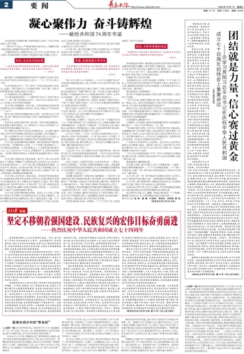 宏伟蓝图鼓舞人心,时代号角催人奋进。今天,我们迎来了中华人民共和国成立74周年。走过峥嵘岁月、历经风雨洗礼,神州大地更加生机勃勃,社会主义中国更加欣欣向荣,全党全国各族人民更加自信自强,正坚定不移朝着强国建设、民族复兴的宏伟目标奋勇前进。