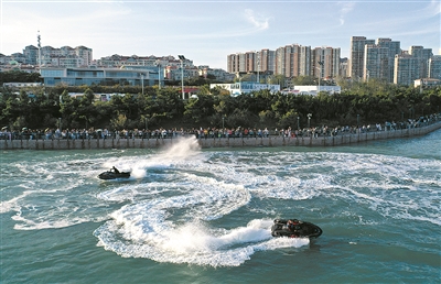 ■游客漫步小麦岛,观赏摩托艇表演,尽享假日时光。 王 雷 摄