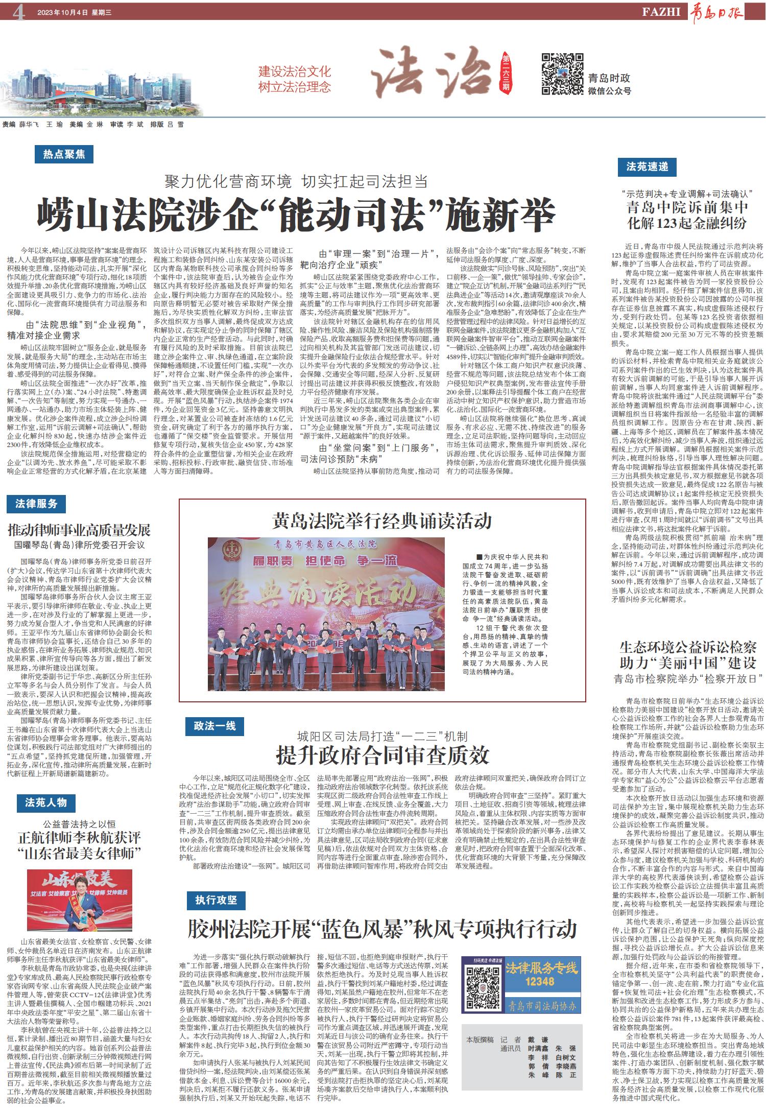 部署政府法治建设“一张网”。城阳区司法局率先部署应用“政府法治一张网”,积极推动政府法治领域数字化转型。依托该系统实现区街二级政府合同合法性审查工作线上受理、网上审查、在线反馈、业务全覆盖,大力压缩政府合同合法性审查办件流转周期。