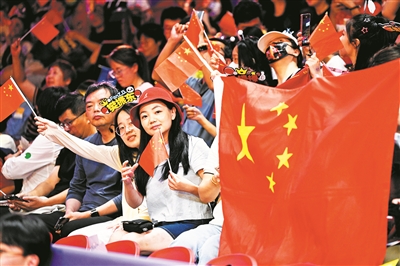 ■观众在比赛现场挥舞五星红旗为参赛选手加油。 新华社照片