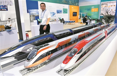 ②跨国公司与中国主题展青岛展区展出的“青岛造”雅万高铁动车组等模型。