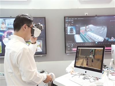 ■工作人员演示虚拟现实技术在教学等方面的应用。 王世锋 摄