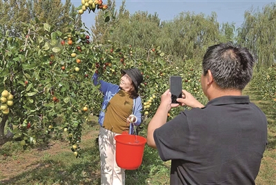 ■游客在蓝村街道王演庄北村枣园里采摘拍照。 张 涛 摄