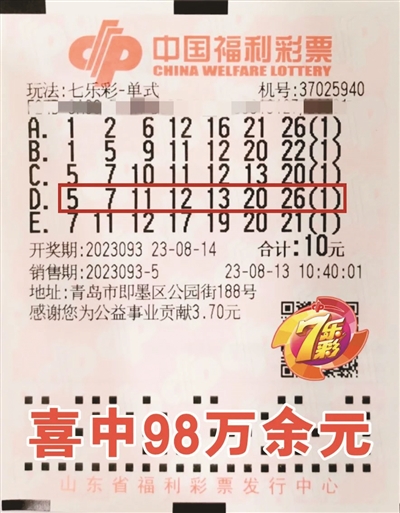 七乐彩第2023093期开奖中,开出号码为05、07、11、12、13、20、26,特别号码为10。当期青岛喜中1注头奖,单注奖金968973元。幸运彩民顾先生在即墨区公园街188号的福彩37025940销售站购买的一张投注额10元、5注号码的七乐彩自选单式票,助他中得1注一等奖、1注二等奖、2注七等奖,奖金共计985311元。