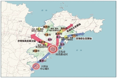 滨海综合发展轴。以海岸带为支撑,推进滨海市域(郊)铁路有序发展,实施西海岸新区、青岛蓝谷“双核”驱动,提升东港、即墨、海阳、莱阳等节点人口和产业聚集能力,推动沿海港口、临港工业区、城镇的融合协作。推动青岛日照同城化发展,深化即墨与海阳的战略合作。向东链接威海、向南链接长三角地区,统筹岸线、海湾、海港、海岛保护利用,大力发展海洋科技与海洋经济,全面增强向海图强发展优势,打造高端要素资源集聚、生产生活生态融合的沿海绿色发展廊道。