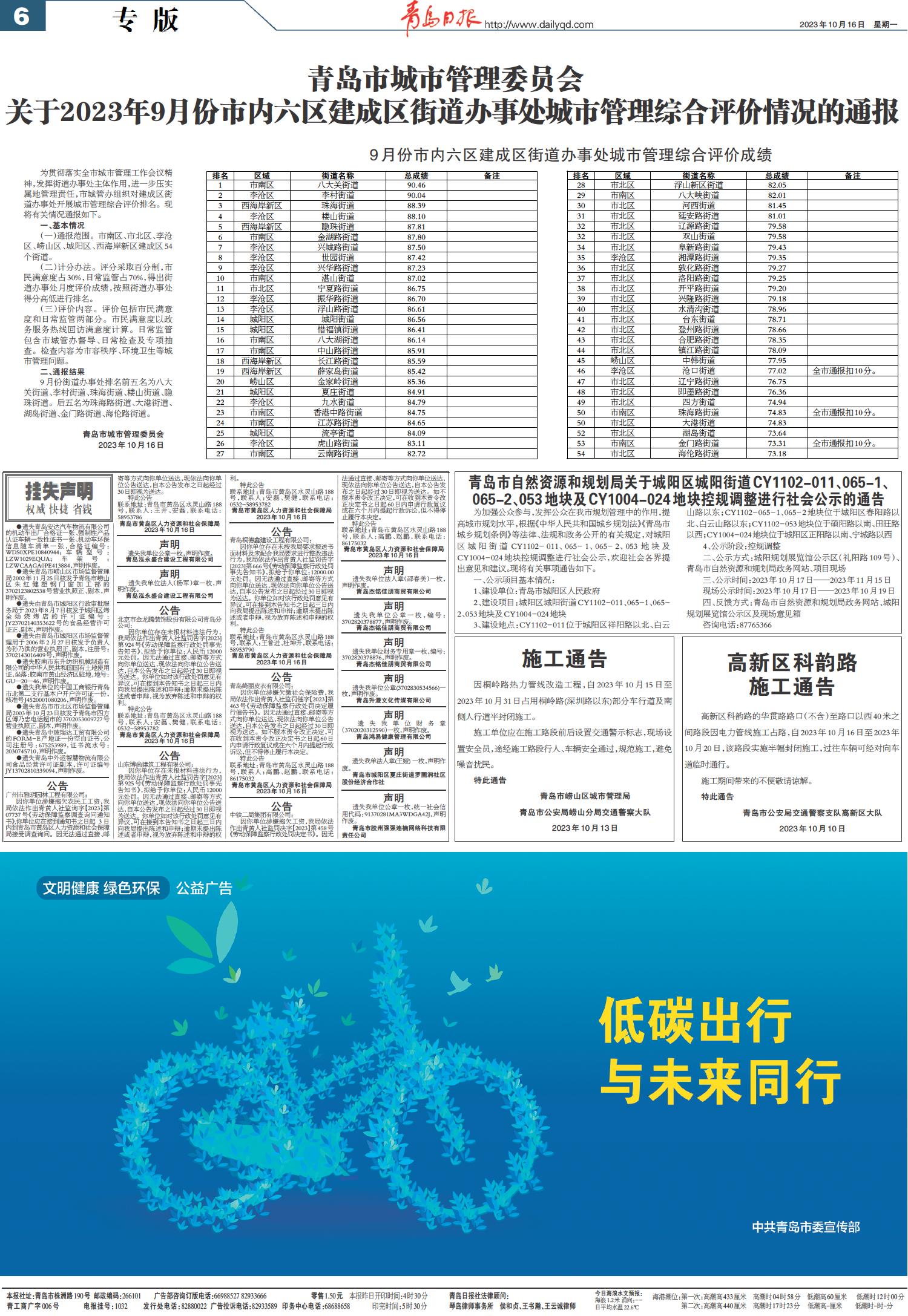 青岛市城市管理委员会关于2023年9月份市内六区建成区街道办事处城市管理综合评价情况的通报