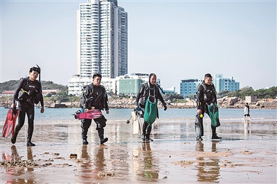 潜水队员打捞近海海域垃圾上岸。