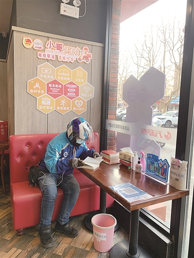 ■干净整洁的暖蜂驿站中,准备了纸巾、纸杯、消毒液等用品,一名外卖小哥正在这里休息、阅读。